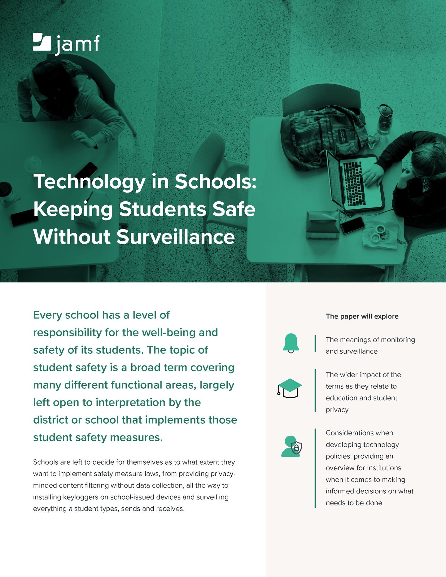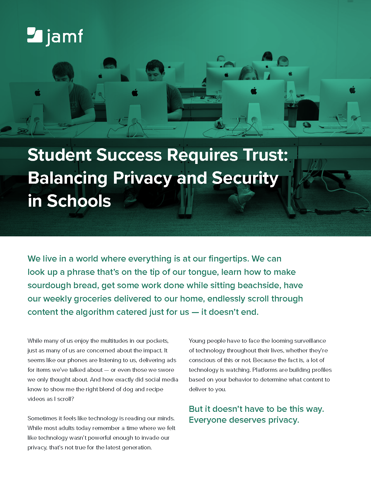Jamf has a privacy-first philosophy, which includes the believe that tech is no replacement for the human element for student well-being. Jamf protects students from dangerous parts of the internet, and helps teachers to manage their classrooms, knowing that Jamf should support education stakeholders and not replace them - which helps students thrive beyond the capabilities any tech alone could give.