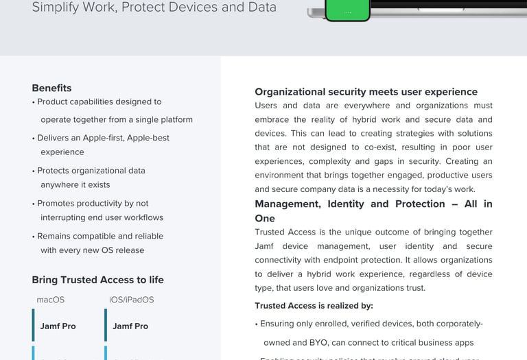 Trusted Access is a solution built upon a foundation of device management principles and capabilities, integrated with modern identity, security and access technologies, to keep organizational data safe and users productive no matter where they are.