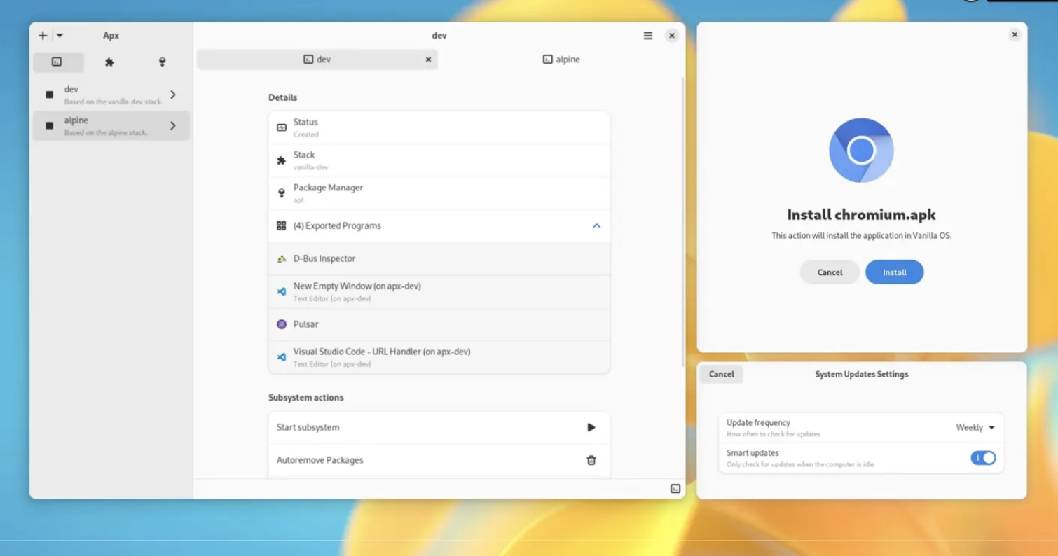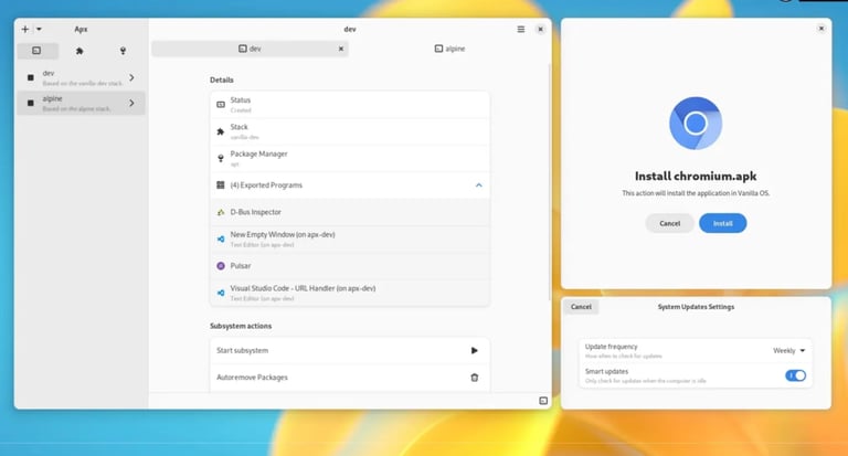 Enhanced Package Management with APX: Another standout feature in Vanilla OS 2 is the Distrobox-based APX utility. APX allows users to install packages from other Linux distributions, offering unparalleled flexibility. With the new GUI, users can create custom environments, add development stacks, and control subsystems with ease. This level of integration and flexibility is rare among Linux distributions, making Vanilla OS a powerful tool for developers and power users alike.
